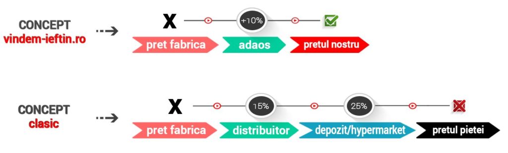 Pentru că nu își depozitează marfa, adică nu plătesc aceste costuri, dar și pentru că negociează constant și au o relație profesională direct cu producătorii, obțin cele mai bune prețuri de pe piață.