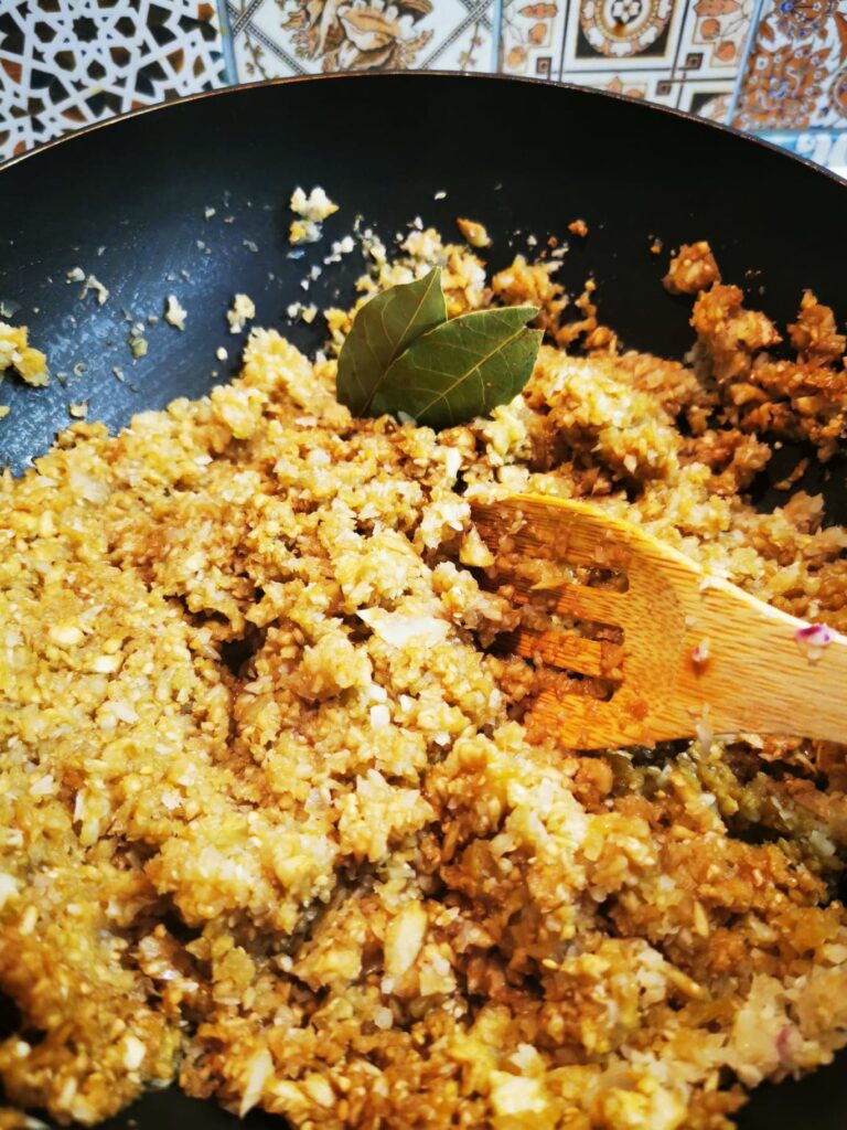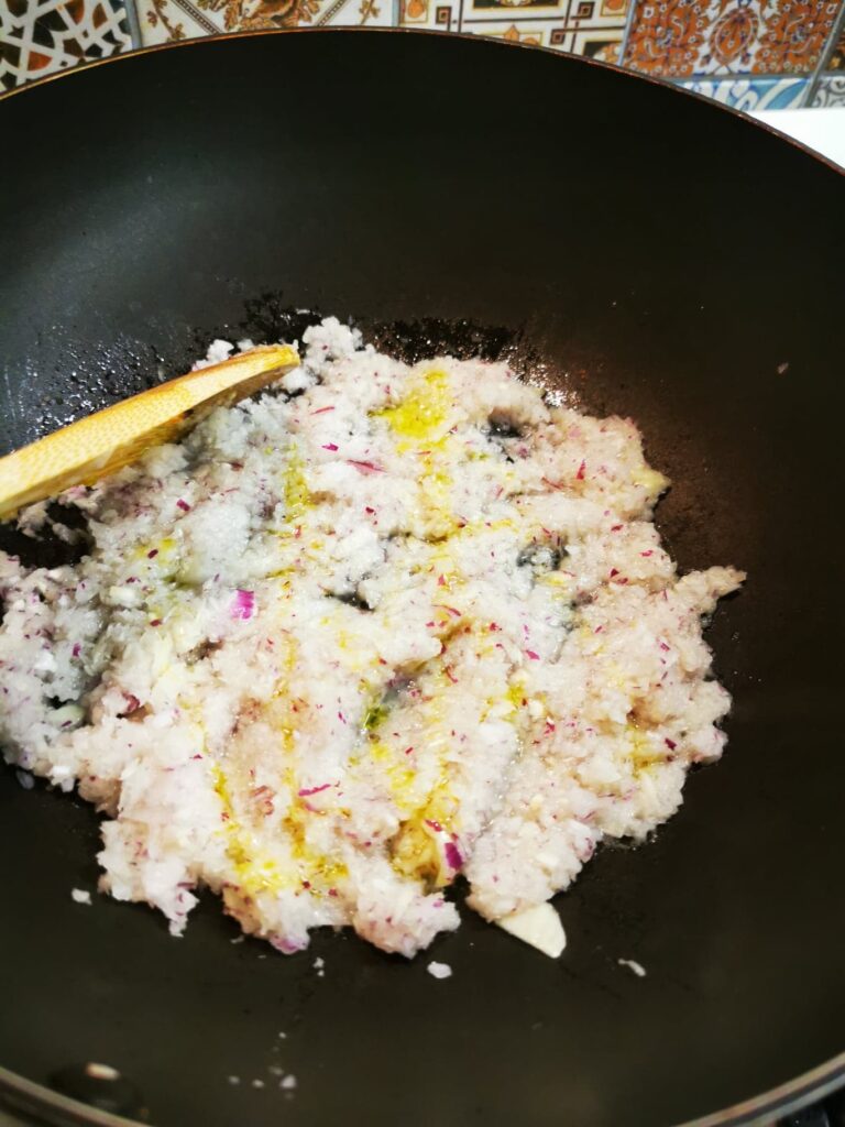 Într-o tigaie mare (am folosit o tigaie wok) punem uleiul de cocos și ceapa mărunțită la călit. Ceapa se poate toca fin sau poate fi folosit un robot de bucătărie – de data aceasta am ales a doua variantă. Când ceapa este cristalizată, punem pătrunjelul, țelina tocate/mărunțite și uleiul de măsline, împreună cu 50ml de apă.
