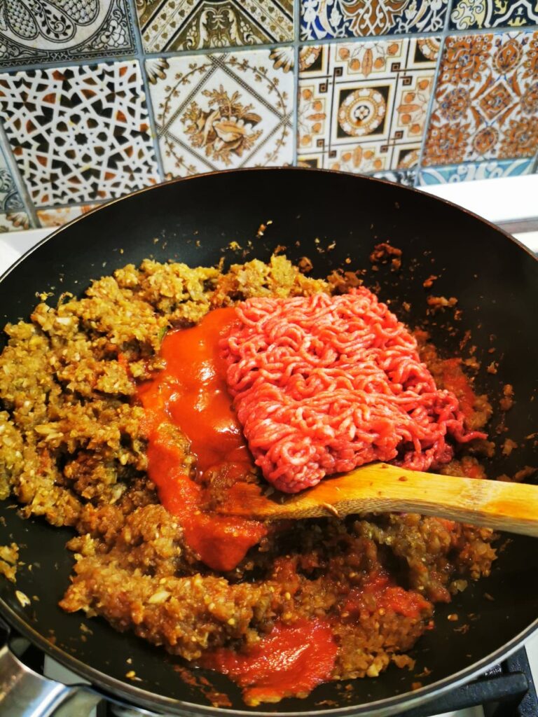 Odată ce a scăzut apa, adăugăm miezul de vinete mărunțite și amestecăm. Și de această dată am folosit pentru mărunțirea legumelor robotul de bucătărie. Însă au fost și dăți când tocam totul cu un cuțit. Concluzia e că nu-i nevoie de instrumente sofisticate pentru bucătărie pentru a face această rețetă.