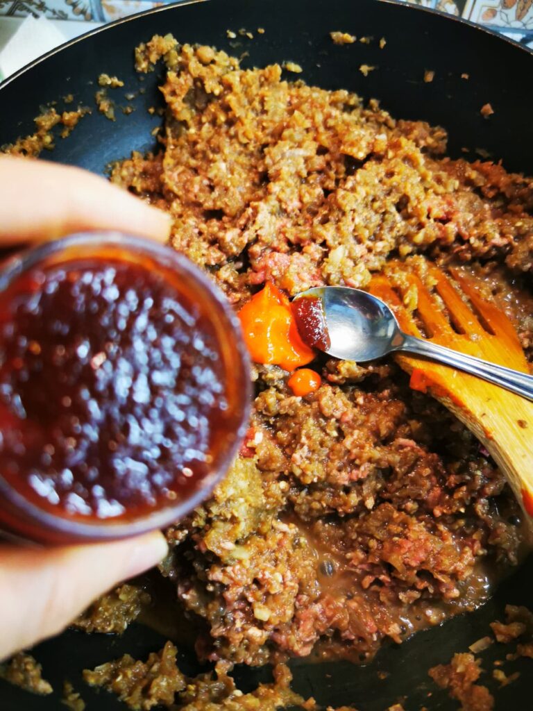 După 5 minute adăugăm pasta de tomate, carnea de vită, foile de dafin, pasta de ardei dulce, gemul de ardei iute și condimentăm cu sare și piper după gust. Lăsăm totul la foc mic 15 minute pentru a se amesteca aromele.